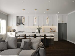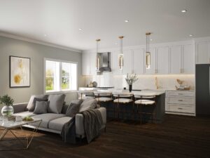 Our open-floor plan designs effortlessly connect the living room and kitchen areas, creating an inviting sense of space and comfort, with pristine hardwood floors and crown moldings adding elegance throughout. Natural light, paired with graceful light fixtures, emit a warm and welcoming glow.