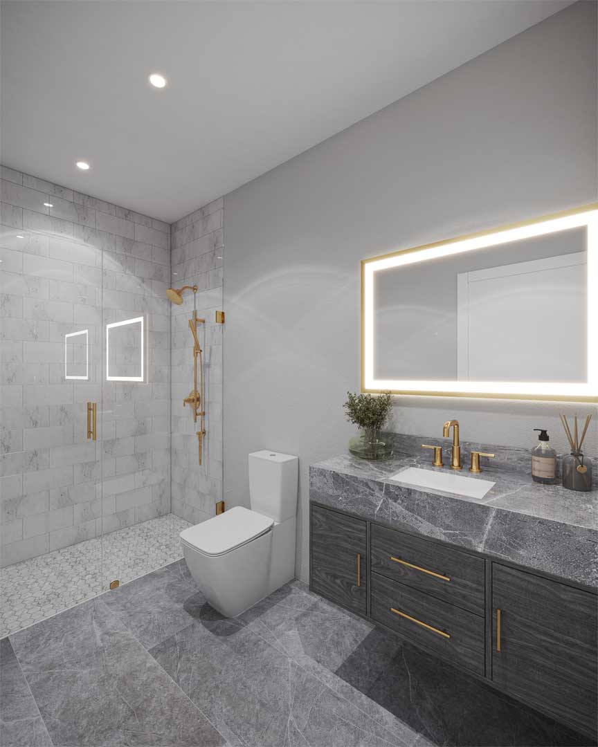 Our bathrooms embody opulence, where upscale fixtures and glass shower stalls elevate your daily routine into a luxurious, spa-like experience within the confines of your home. Stone surfaces throughout provide each abode with high-end, natural beauty while signifying the enduring quality and durability that characterizes every facet of these exceptional residences.